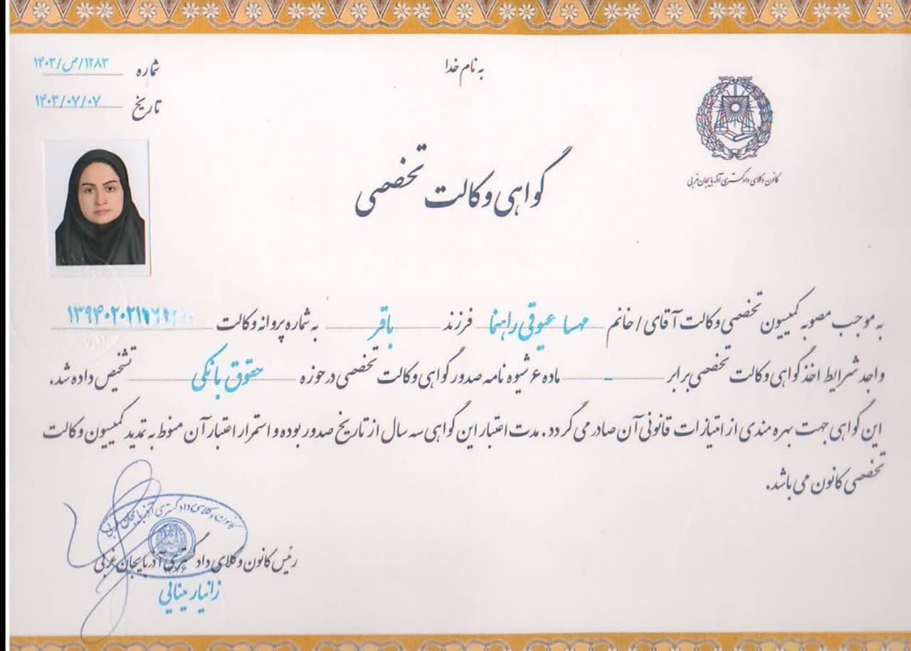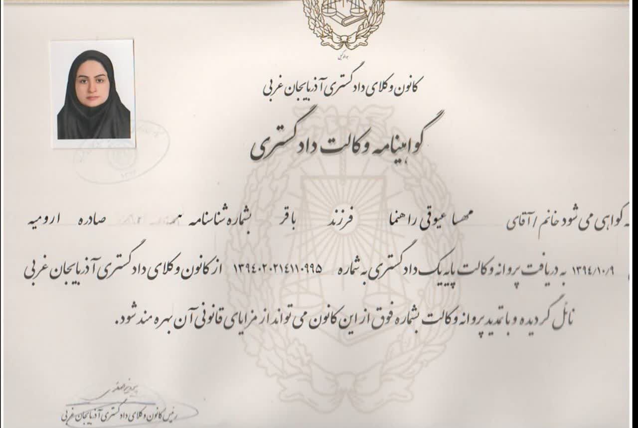 من مهسا عیوقی، وکیل پایه یک دادگستری و عضو کانون وکلای آذربایجان غربی هستم.فارغالتحصیل کارشناسی ارشد حقوق خصوصی از دانشگاه تبریز و دارای بیش از ۱۰ سال سابقه در حوزههای خانواده، کیفری، بانکی، املاک و حقوق پزشکی میباشم.در آزمون وکالت سال ۱۳۹۲ رتبه ۱۰ و در اختبار رتبه ۵ را کسب کردم.
